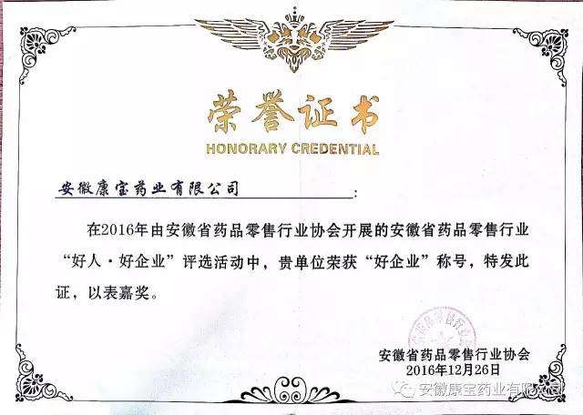 12月26日,由省藥品零售行業(yè)協(xié)會主辦的安徽省藥品零售企業(yè)“好人 好企業(yè)”頒獎典禮在省城合肥隆重舉行??祵毸帢I(yè)經過逐級推薦、層層考核、公開評審等程序,最終被評為“好企業(yè)”稱號,康寶藥業(yè)員工青春嬌、李洪被評為“好人”稱號