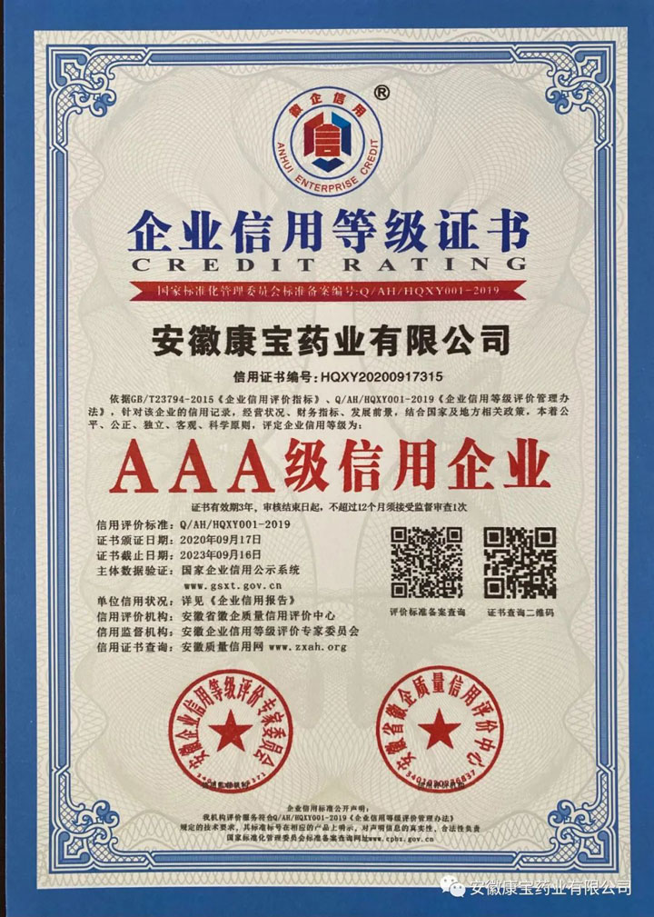 近日,安徽企業(yè)信用等級評價(jià)專家委員會(huì)公布了2020年“AAA級信用企業(yè)”評選結(jié)果,安徽康寶藥業(yè)有限公司喜獲“AAA級信用企業(yè)”榮譽(yù)稱號,為最高信用等級。